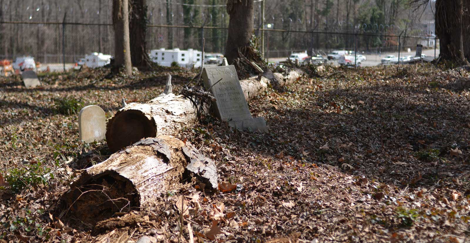 Overrun by destructive tree and ivy growth, vandalism, and developments that have boxed the cemetery in on every side with roads, houses, and telephone company parking lots, Geer is a far cry from what most people would assume a cemetery should be and look like—a problem endemic to countless Black cemeteries. In fact, up until a few years ago, the property was so densely overgrown that it wasn’t even recognizable as a burial place.