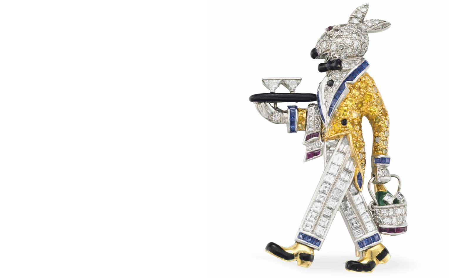 Jewelry doesn’t have to be serious to be well-designed, well-crafted and made of precious materials. Raymond Yard’s rabbit brooches certainly fit those categories. This exquisite and elegant bunny is one of a series of brooches depicting the furry-eared animal serving various types of alcoholic drinks, often carrying an ice bucket, serving towel over his arm, and impeccably dressed in a tuxedo. The head, right up to the pointy ears, features pavé-set diamonds. The lapels and cuffs are framed in calibré-cut sapphires while the jacket is made of yellow diamonds. His trousers are set with crisp rows of square cut diamonds. A green enamel champagne bottle nestles in the diamond and ruby-set bucket, articulated to allow the bucket to swing from its handle. Mounted in platinum and gold, the brooch stands just 1-7/8" high, making the detail all the more remarkable. This piece doubled its pre-sale estimate, an indication of how much Raymond Yard’s unique style and fine make are still appreciated nearly a century after his work first appeared in the marketplace.
