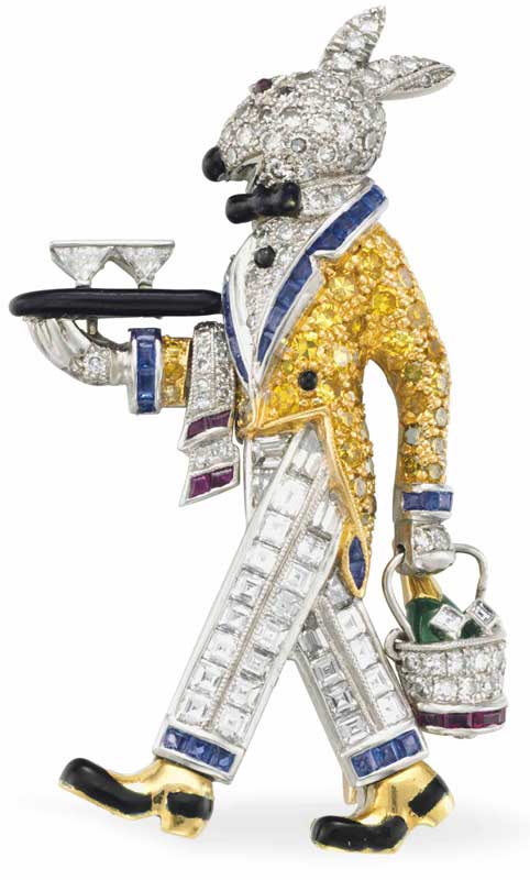 Other brooches in the rabbit-waiter series feature pants set with emeralds and all-white diamond jackets, all of them wearing proper shoes. Yard began the rabbit waiter series in 1928 and continued through the early 1930s, during the prohibition of serving any kind of alcoholic drinks. Perhaps it offered a wink to the prodigious amount of alcohol that was actually served during the era since the law simply pushed drinkers underground, into speakeasies and often into the arms of the criminal underworld.