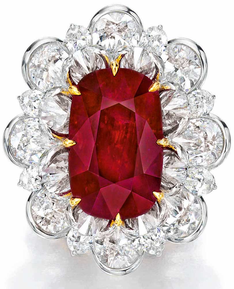 The exquisite ruby was set within a frame of sixteen pear-shaped diamonds, all of which were certified to be the finest color and clarity. The shank of the ring was pavé-set with brilliant-set pink diamonds.