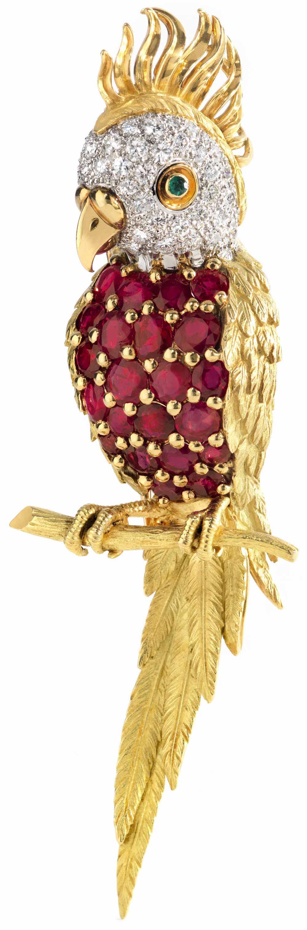 The unmistakable outline of an elegant parrot, claws grasping its perch, is captured by Van Cleef & Arpels in this gold, diamond and ruby brooch. This French-made jewel features a face set with round diamonds, the body puffed out in round, prong-set rubies, with one emerald eye. The wings, crown and tail feathers are all depicted in 18k yellow gold. Delicate etching suggests the feathers while the perky beak is depicted in bright polish gold. While this little parrot will never fly, the lot soared up to its pre-sale high estimate, fetching $25,512.