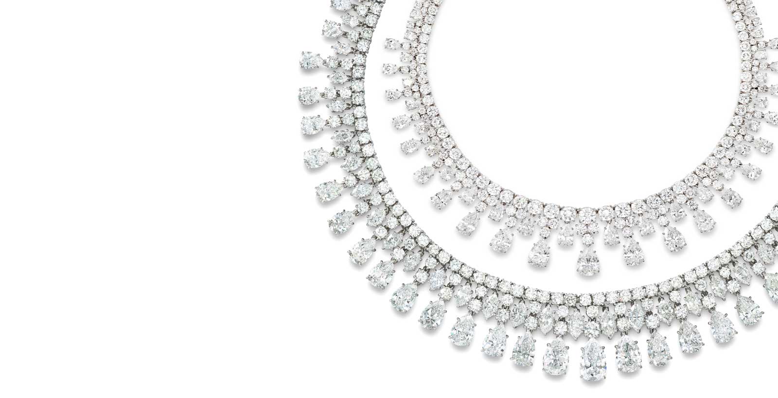 Ms. Domyan would wear this necklace nestled above lot #112, which features two rows of graduating round diamonds, suspending a fringe of pear-shaped diamond drops. The total weight of this necklace is 86.30 carats. Many of the pear shapes that comprise the lower level of the necklace would serve as impressive engagement ring center stones, with the largest diamond weighing in at 3.43 carats.