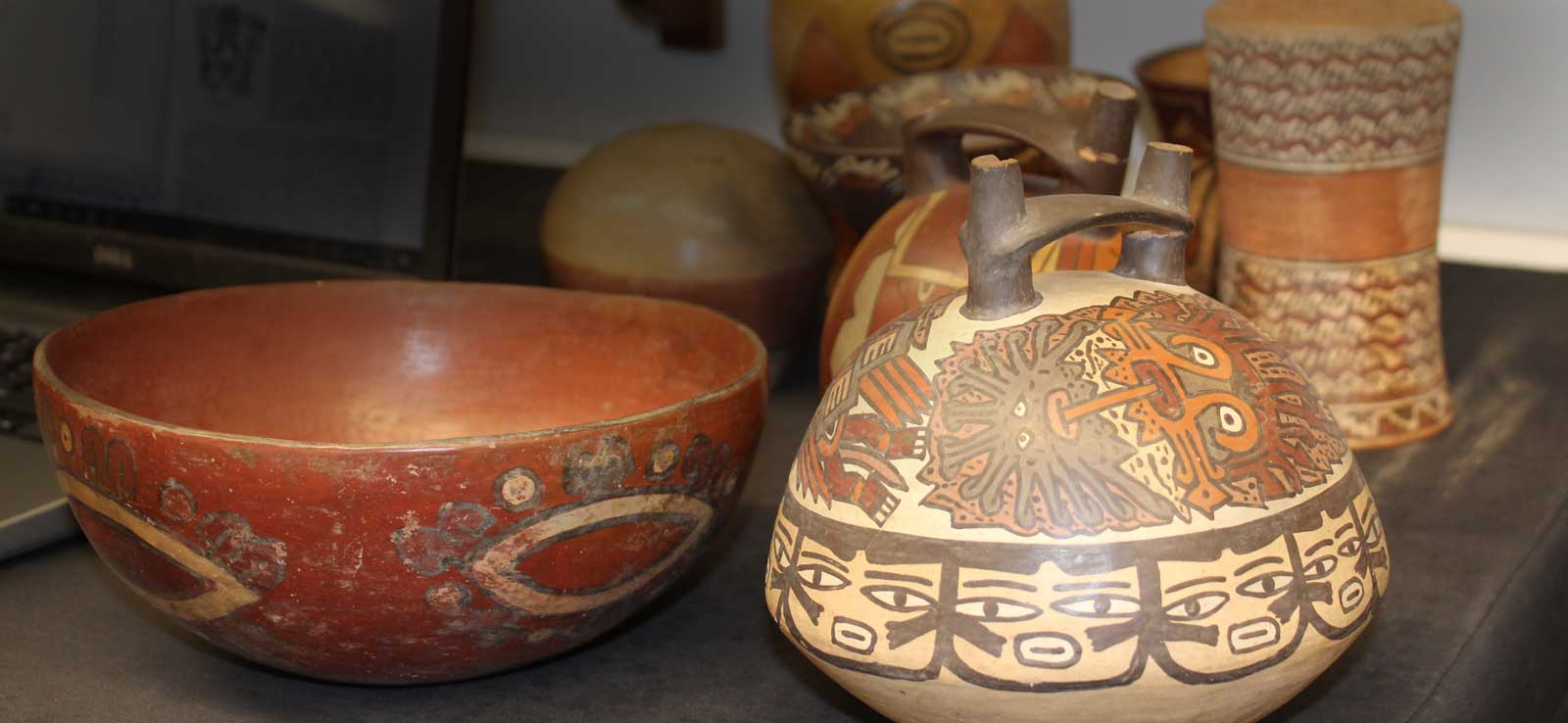 These ceramics are the most colorful pre-Columbian pottery ever produced in Peru. They are painstakingly handcrafted and painted with complex, sometimes dizzying, geometric and natural designs. Rich reds, yellows, oranges, and browns depict scenes of life, death, birth, and war. The iconography is broad in scope: both mundane plants and life-giving waters of the desert contrast with fantastical chimeras of animal-faced gods and startling motifs of severed trophy heads, lips sutured, and eyes closed in death.