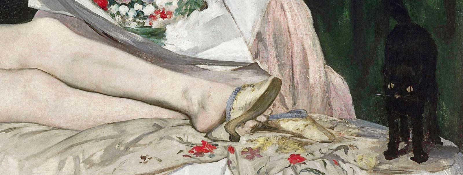 Manet uses a black cat, snarling at the pink feet of his Olympia and staring at us with his yellow eyes, to represent what we cannot see behind the hand.