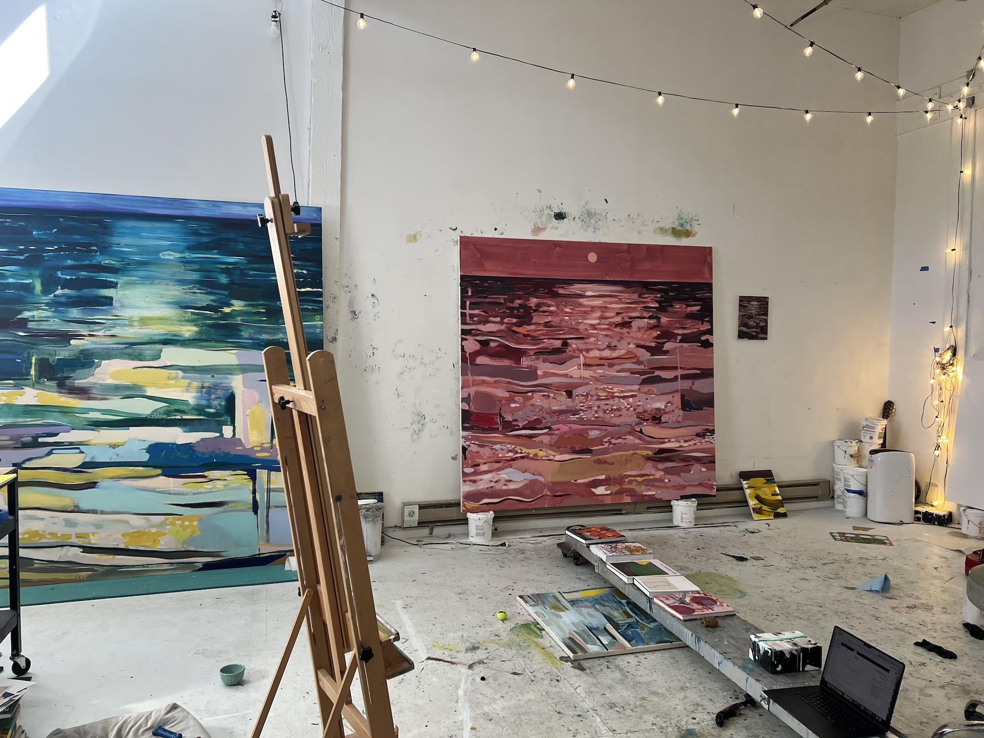 To build her paintings, she puts her canvases down on the floor and sets a kind of concrete platform over them, which she can roll back and forth, spanning the works so she can follow her progress, viewing them from above and below, mimicking the course of the waves in her paintings and her thoughts.