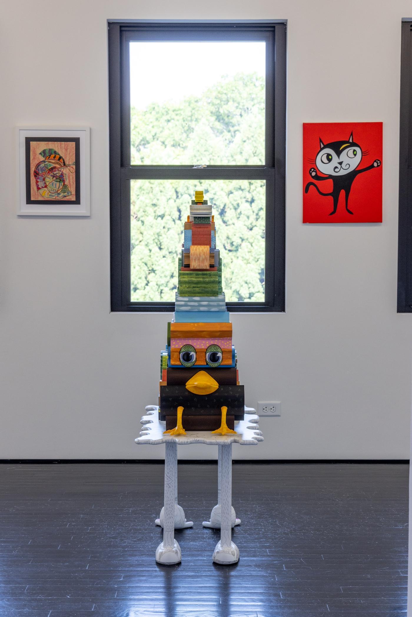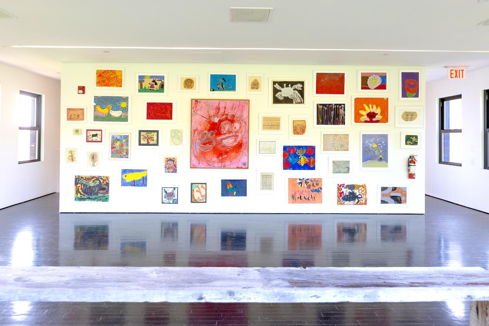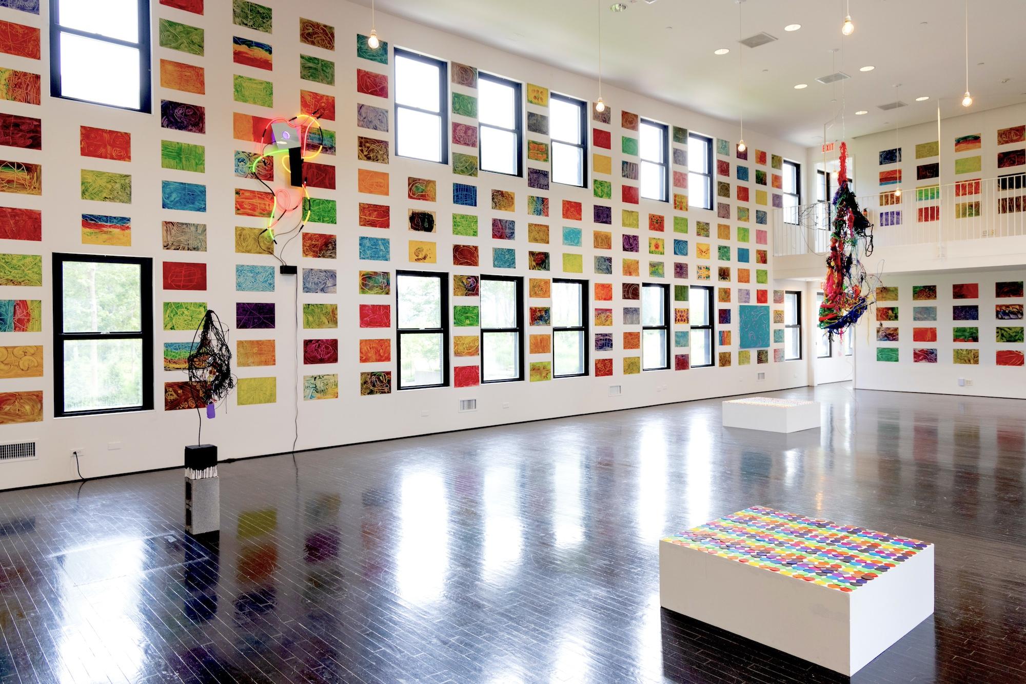 The most eye-catching of the installations is in a spacious gallery that is brilliantly, magnificently awash in color from row after row of the children’s art gridded on the walls—suggesting a cathedral punctuated by the illusion of stained glass—counterpointed by Michelle Segre’s floor pieces, a Keith Sonnier light sculpture mounted high, and other works.