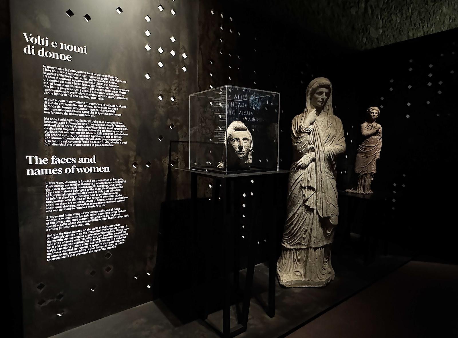 A display area on women and their portraiture and names within the exhibit, Essere Donna nell’Antica. On view at the Pompeii Archaeological Park through January 31 2026.