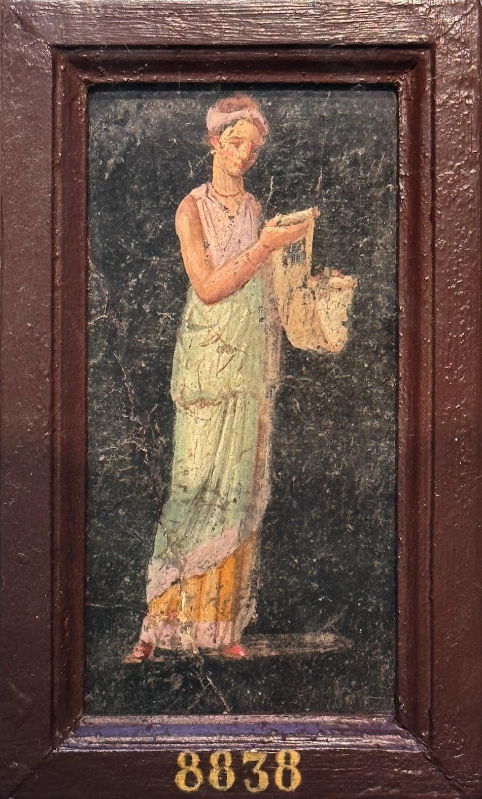 Standing maiden reading a scroll. Fresco, Pompeii VII 2, 39 (House of Giuseppe II), ca. 1st century CE [Museo Archeologico Nazionale di Napoli]. Many Roman women, especially those who were married and financially secure, engaged in literary and other intellectual pursuits, continuing educations they began as girls.