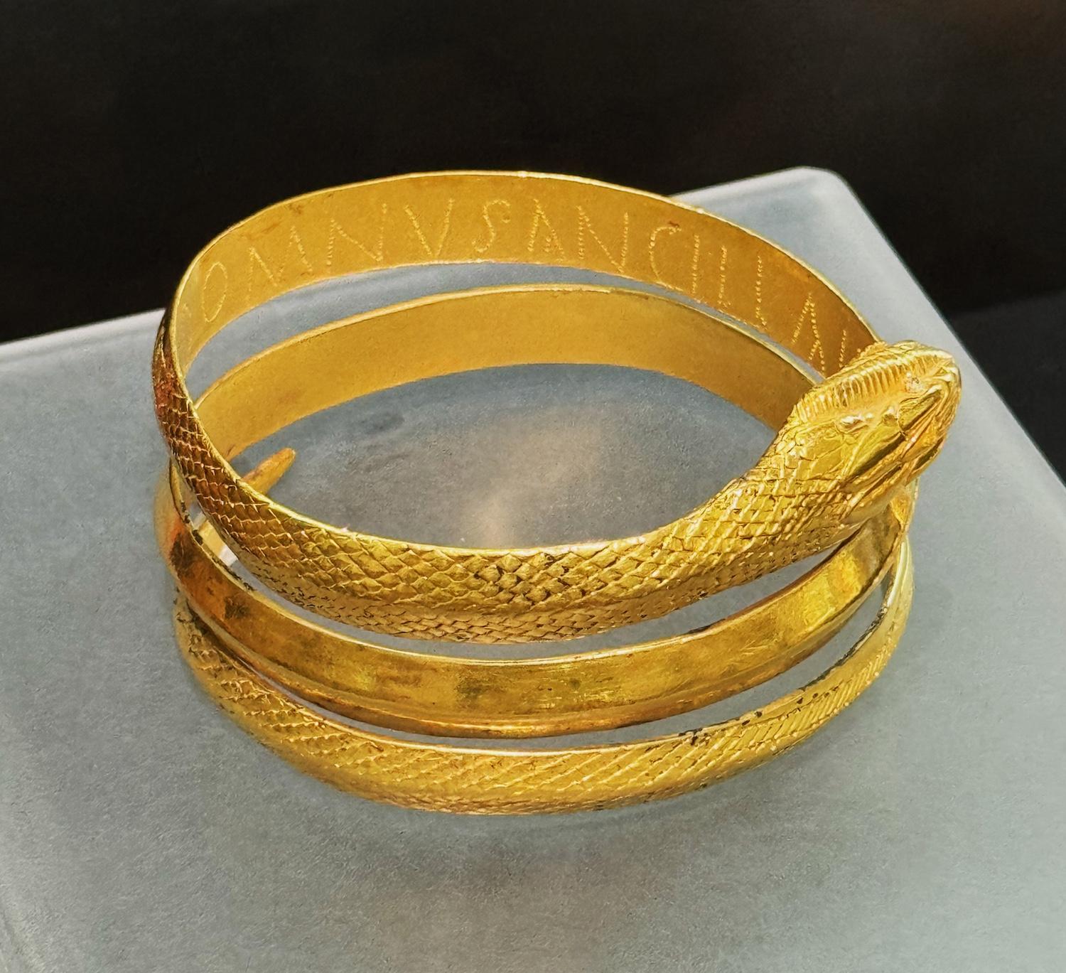 Bracelet of the slave girl of Moregine. Gold and glass paste bracelet in the shape of a snake, ca. 1 century CE, found in the Moregine suburb of Pompeii [Parco Archeologico di Pompei].