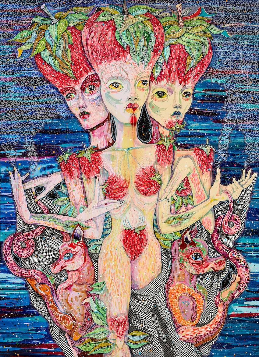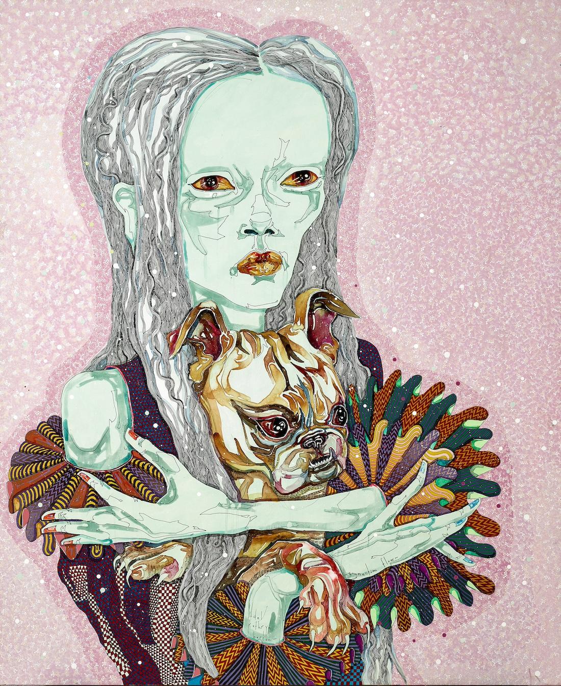 Known for her quirky, mutable, magically unconventional depictions of people and animals, often in surrealistic dreamscapes, Barton creates otherworldly environments using sequins, markers, gouache, and glitter. Drawing on folktales, personal mythology, and cosmic imagery, she creates stunning, sensual tableaux. Sometimes, her figures grow petals or sinuously emerge from a knot of intricately patterned snakes, while surrounded by stars. The people in her fantastical environments often have elongated limbs, exaggerated features, towering pompadours, and intricate jewelry, giving them a sci-fi rococo fairytale feel.
