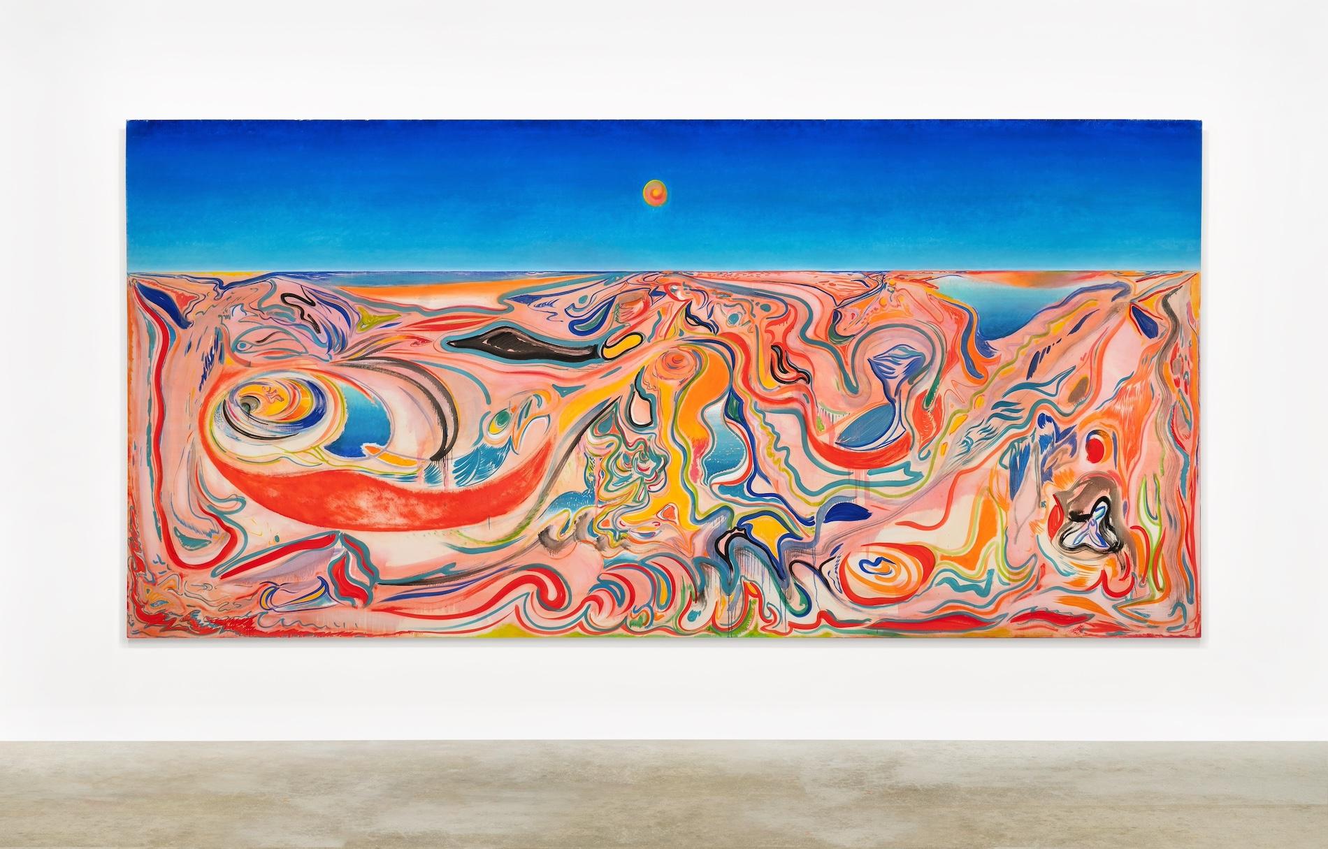 Sky Hopinka captures stunning cloudscapes in Mnemonics of Shape and Reason. Wangechi Mutu’s My Cave Call depicts a mysterious cavern. In Todd Gray’s Present History (1619), montages of historical colonialist imagery are superimposed over lush tropical leaves. In Alejandro Piñeiro Bello’s Viajando En La Franja Del Iris, vivid abstract swirls of color coalesce into a surrealistic landscape. Jaune Quick-to-See Smith’s Echo Map is a collaged depiction of the United States in alternating colors of green, red, blue and yellow bleeding anemic colors across the canvas. And in Firelei Báez’s Convex (recalibrating a blind spot), a blue wave crests against sugar-refinery statistics, with a red starburst at the center of the wave and a brown figure kneeling in the right corner.