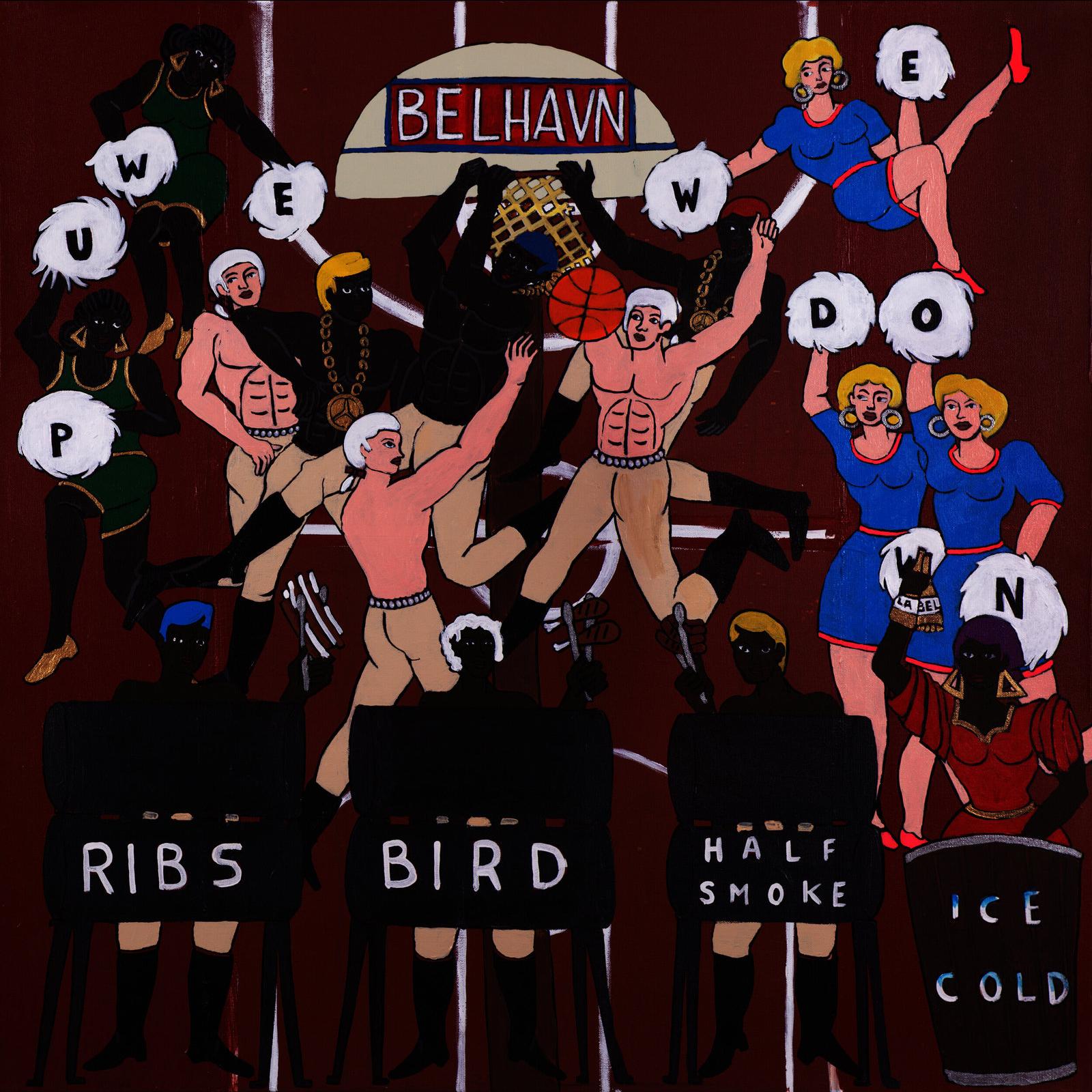 Umar Rashid, We up. We down. The Belhaven Invitational Basketball tournament and cook out ends in defeat for the Irish indentures at the hands of Supreme Team Tobacco. The historical origin of the half smoke, 2021. Acrylic & spray paint on canvas 36 x 36 in (91.44 x 91.44 cm)