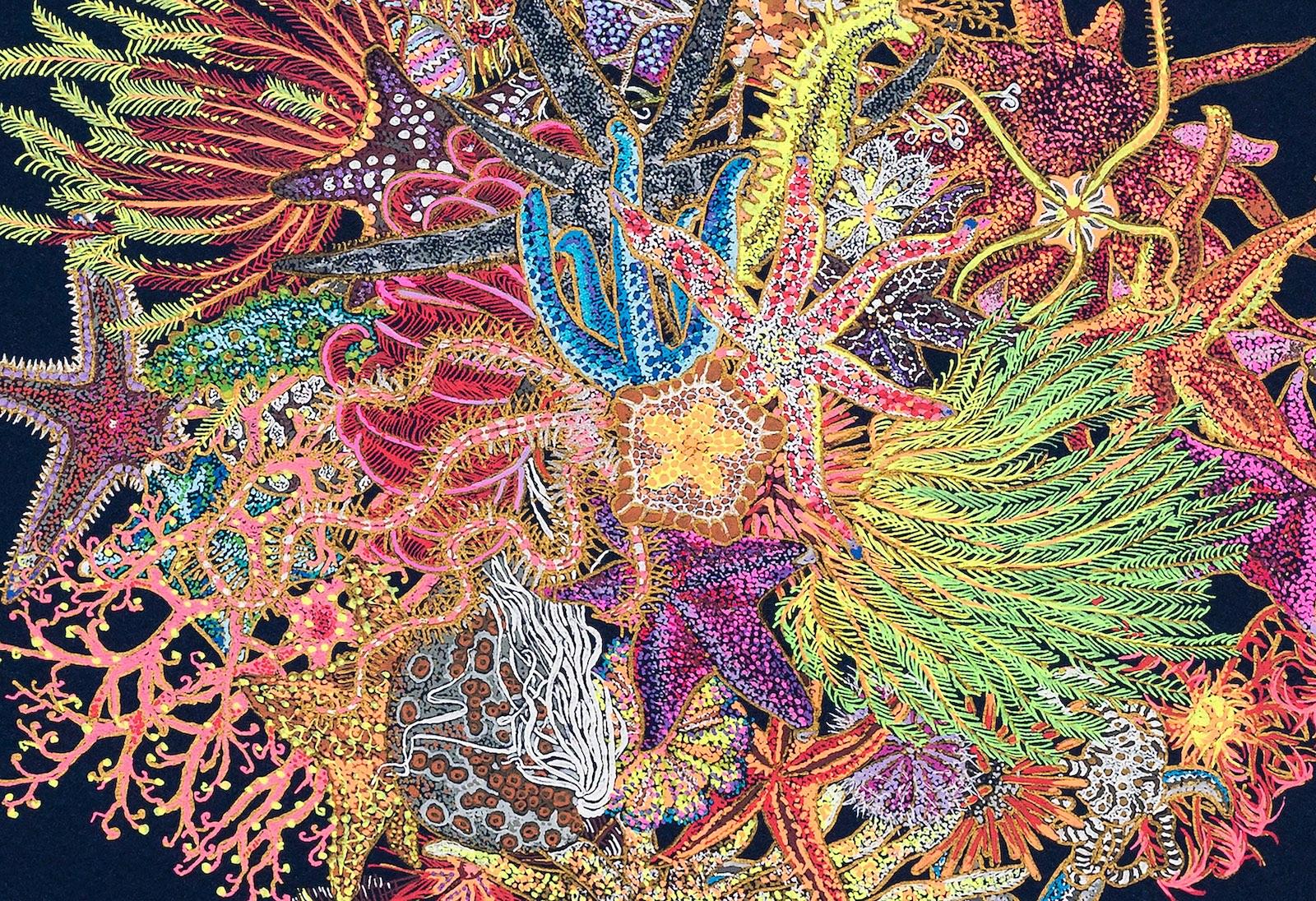 With her proximity to the havoc of COVID-19 (Queens, NY, where the artist is located, was a hotspot that spring), Carlsmith purposefully chose joyful inks in fluorescent, sparkling, metallic, opaque, and translucent bodies and laid them over a gold base on a deep blue background, a play on the motif of painted vaults depicting stars in the night sky. The artist decided to make “quarantines” of echinoderms–forty echinoderms in an echo of the historical number of days in a quarantine–as a way to mark the time. When Carlsmith began to look into echinoderms more closely, she also fell in love with the language scientists use to describe them. Because the bodies of echinoderms are so alien in comparison to vertebrates, the names are rich with complex visual metaphors. “Reading a description of an echinoderm can feel like reading a poem,” the artist relates, “Looking at them can feel that way too – the simple abundance and variety of forms is staggering, and the fact that they are living expands my sense of what that means.”
