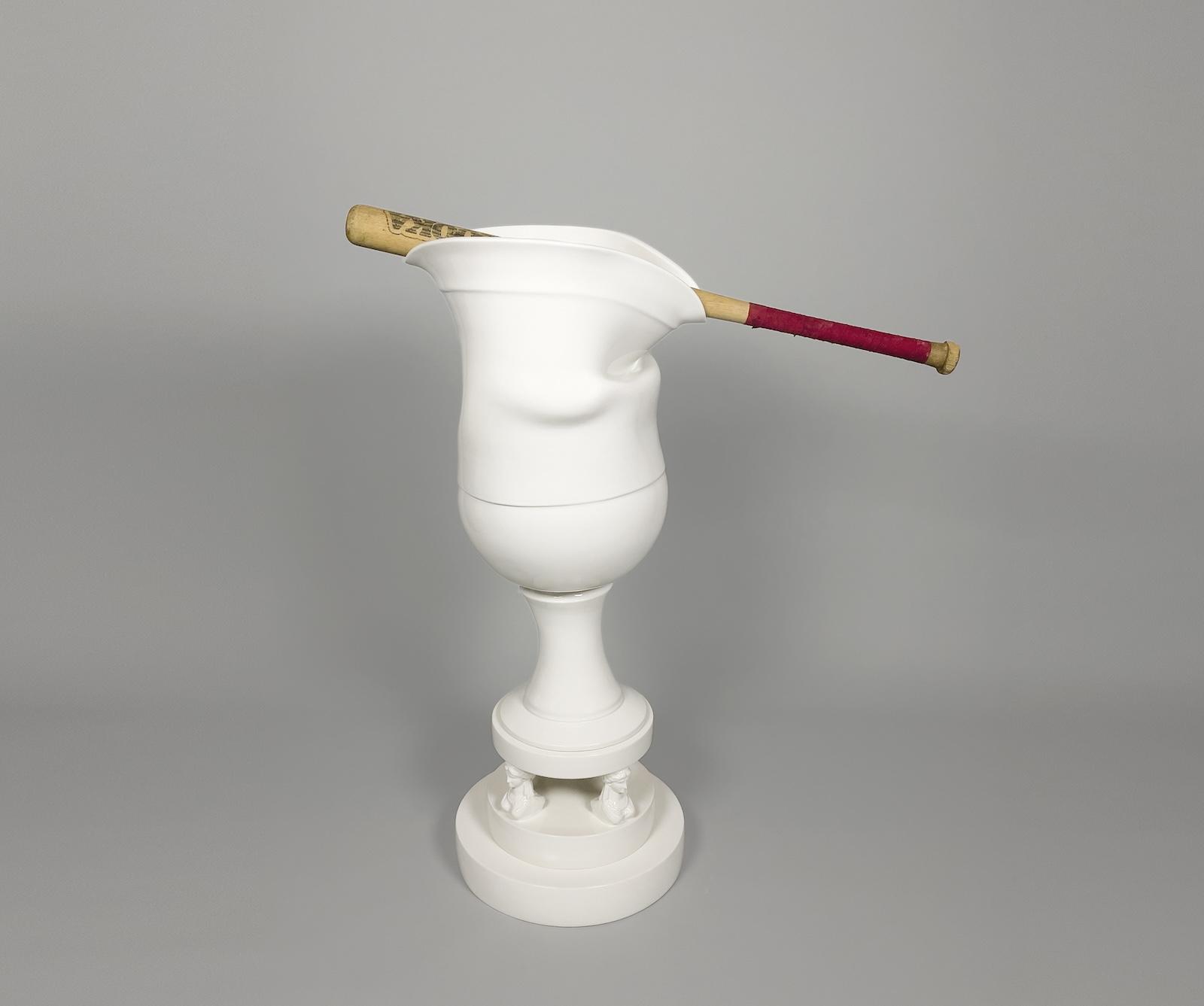 Laurent Craste, Iconocraste au bat VII, 2024/25, Porcelain, glaze, and baseball bat, 40 3/4 × 33 5/16 × 14 ¾ inches