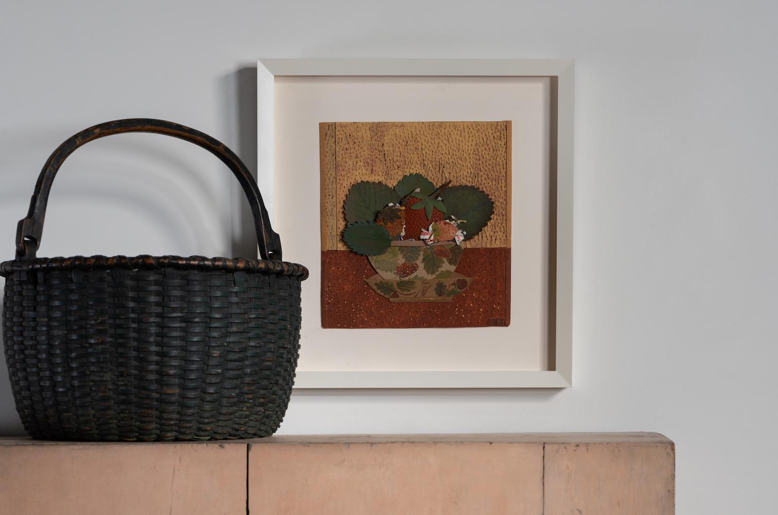 Laurene Krasny Brown, Berry Bowl, 2017. Gouache on cut paper. 10.5 x 9.5 in. Pictured with a 19th century green-painted splint basket atop an antique cupboard in original pink paint