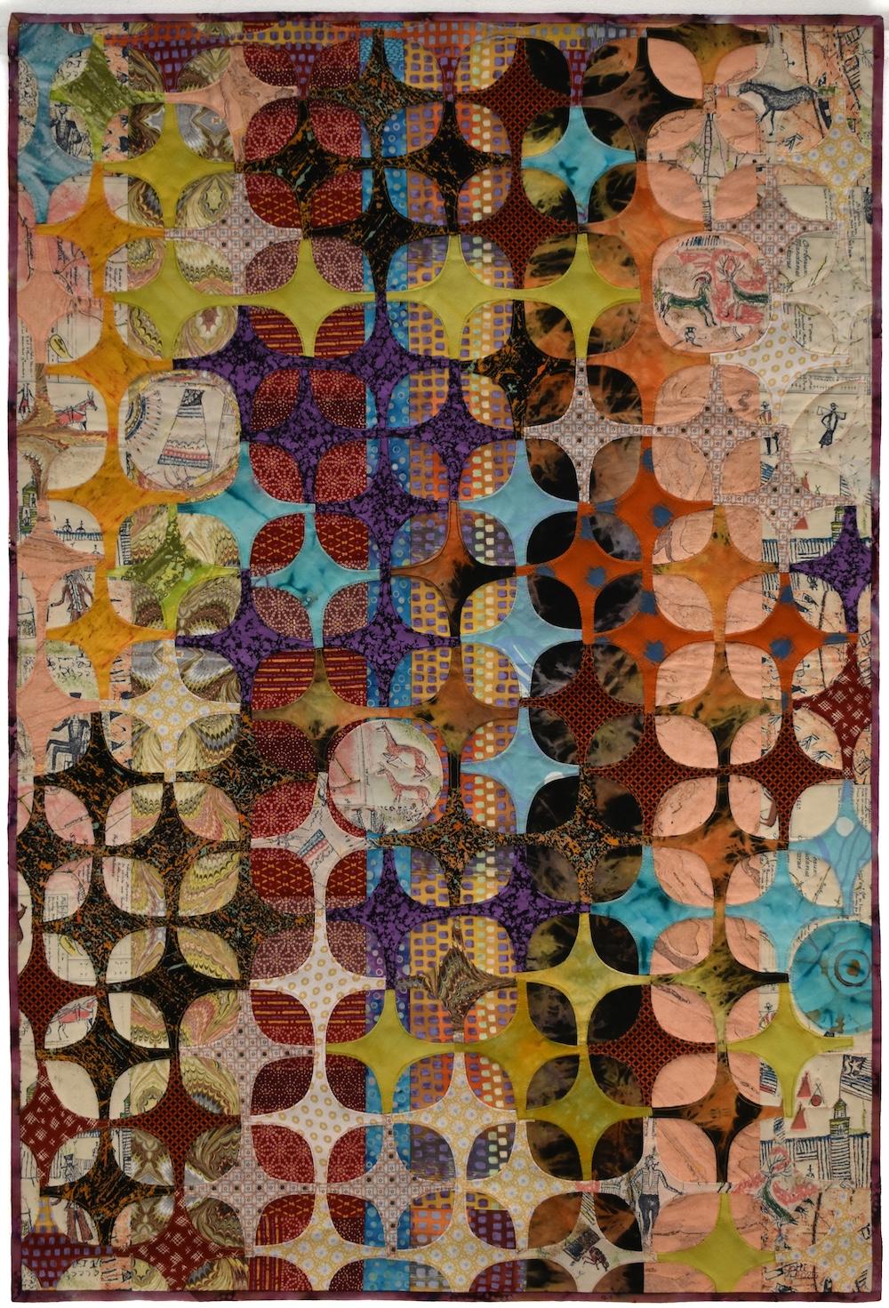 Yadi is a native of the East Coast, where her grandparents immigrated from Poland and Ireland. Early childhood experiences with her grandmother drew her to fabric and its great variety. Her grandmother scavenged fabric from clothes, blankets, and castoffs to make household objects. (Yadi, in her words, has a “scavenger lineage.”) A love of color and pattern came from her mother’s and grandmother’s gardens, and she developed sewing skills as a young child. She crafted her sewing and fiber art skills when she moved after graduation from a two-year liberal arts college to West Virginia for an off-the-grid life, back-to-the-land movement. She left Appalachia to live and work in Santa Fe, New Mexico, and has been a part of a highly successful alternative medicine practice of eight practitioners for over forty years.