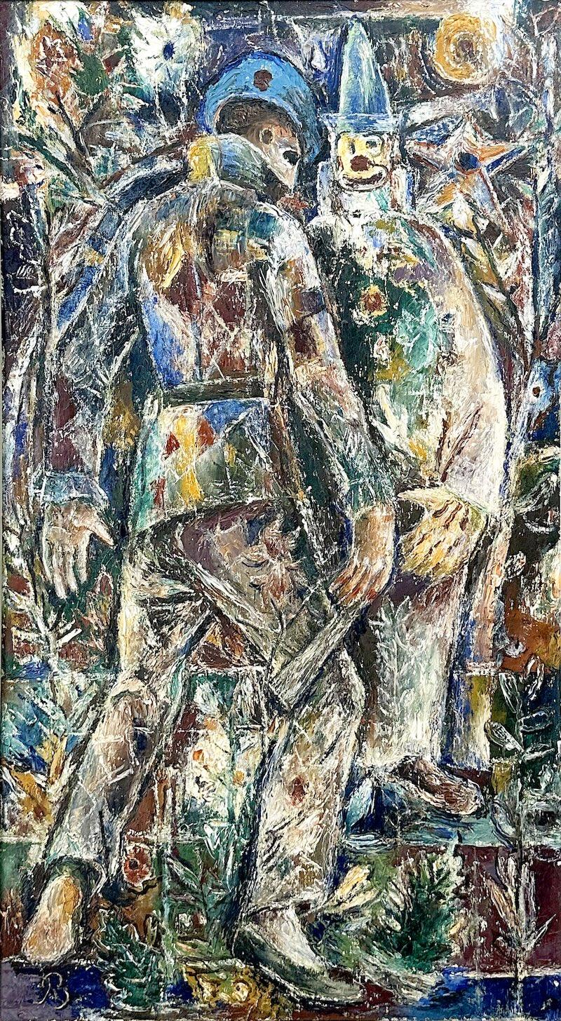 In 1911, St. Louis–born artist Albert Bloch was invited as the only American to exhibit with the avant-garde Blue Rider group in Munich alongside leading figures such as Wassily Kandinsky and Franz Marc. After World War I, he essentially disappeared from the and settled at the other end of the world in Lawrence, Kansas. There he painted primarily for himself and his younger wife, Anna, no longer exhibiting his work. The resent oil on canvas titled The Spangled Motley from 1953 is a rare example of Bloch revisiting his Expressionist period. Found in pristine original condition, this work was purchased directly from the artist in the mid-20th century.