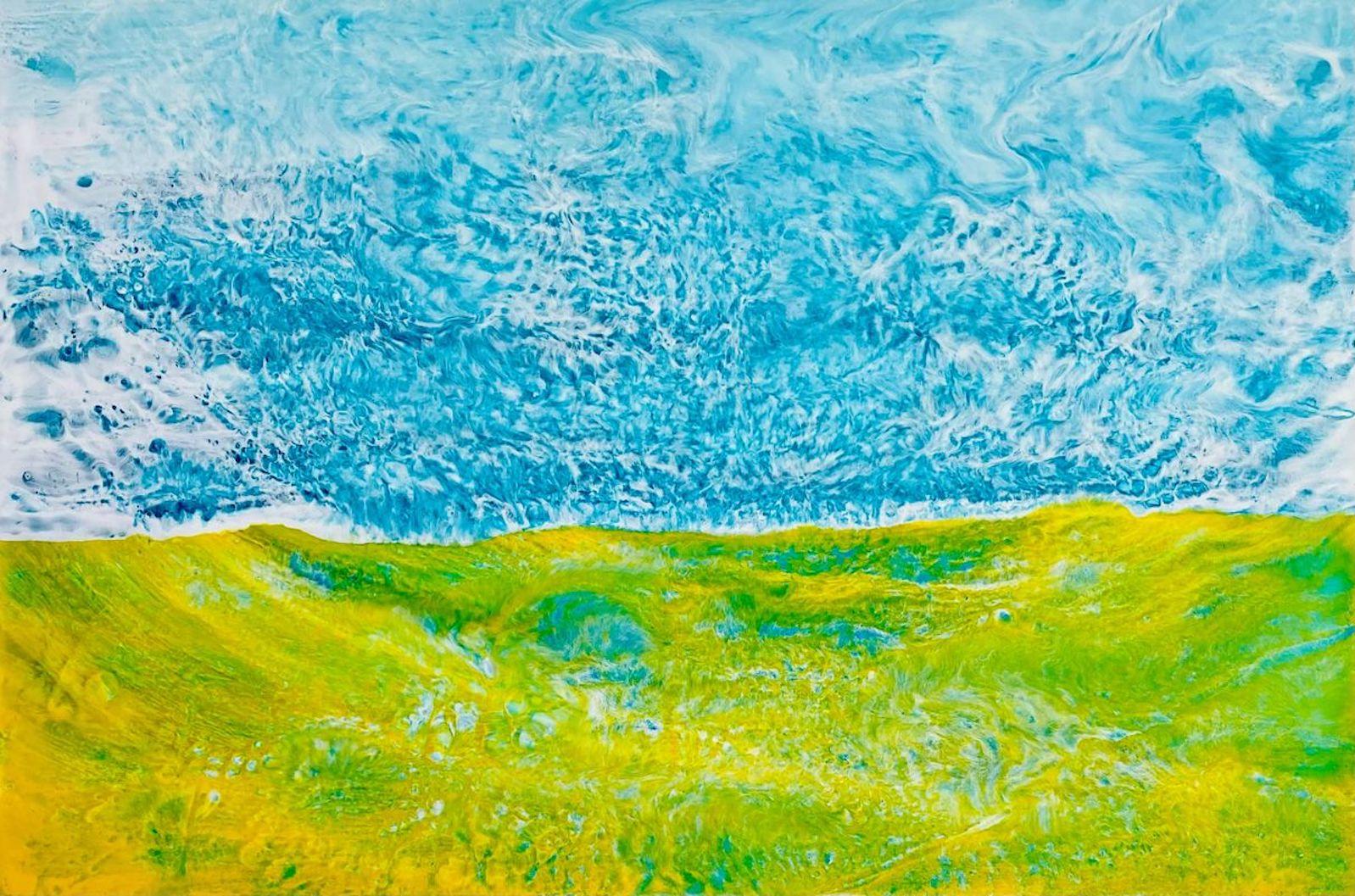 Responding in chroma lifted from these shifting visions, the crisp minimalist color fields of Whitcraft’s work continues the conversation, raising the discussion to a sphere of colors capturing the essence of each pair of Schiffman’s encaustic works. While the shifting reality of landmarks in Icelandic geography continues in tandem with the pandemic, Schiffman imports a range of foreign life forms and elements into the landscapes–challenging the sense of reality of a known space. Whitcraft responds to these encaustic forays with digitally created elegant color fields printed on Hahnemuhle Museum Etching paper, a perfect counterpoint to Schiffman’s intense multi-layered encaustic works on wood. This is a visual journey with two artists working in vastly different styles across the same landscape.
