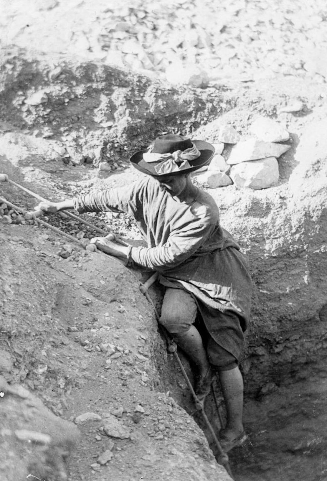 Hilda Petrie descending a ladder into an Egyptian Tomb.