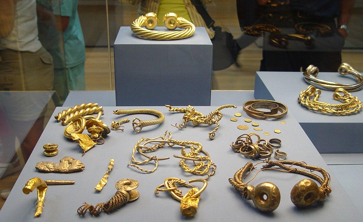 The Snettisham Hoard on display at the British Museum. The hoard contains hundreds of pieces of gold and other metal objects including about 70 intact torcs. License